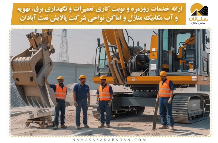 ارائه خدمات روزمره و نوبت کاری تعمیرات و نگهداری برق، تهویه و آب مکانیک منازل و اماکن نواحی شرکت پالایش نفت آبادان
